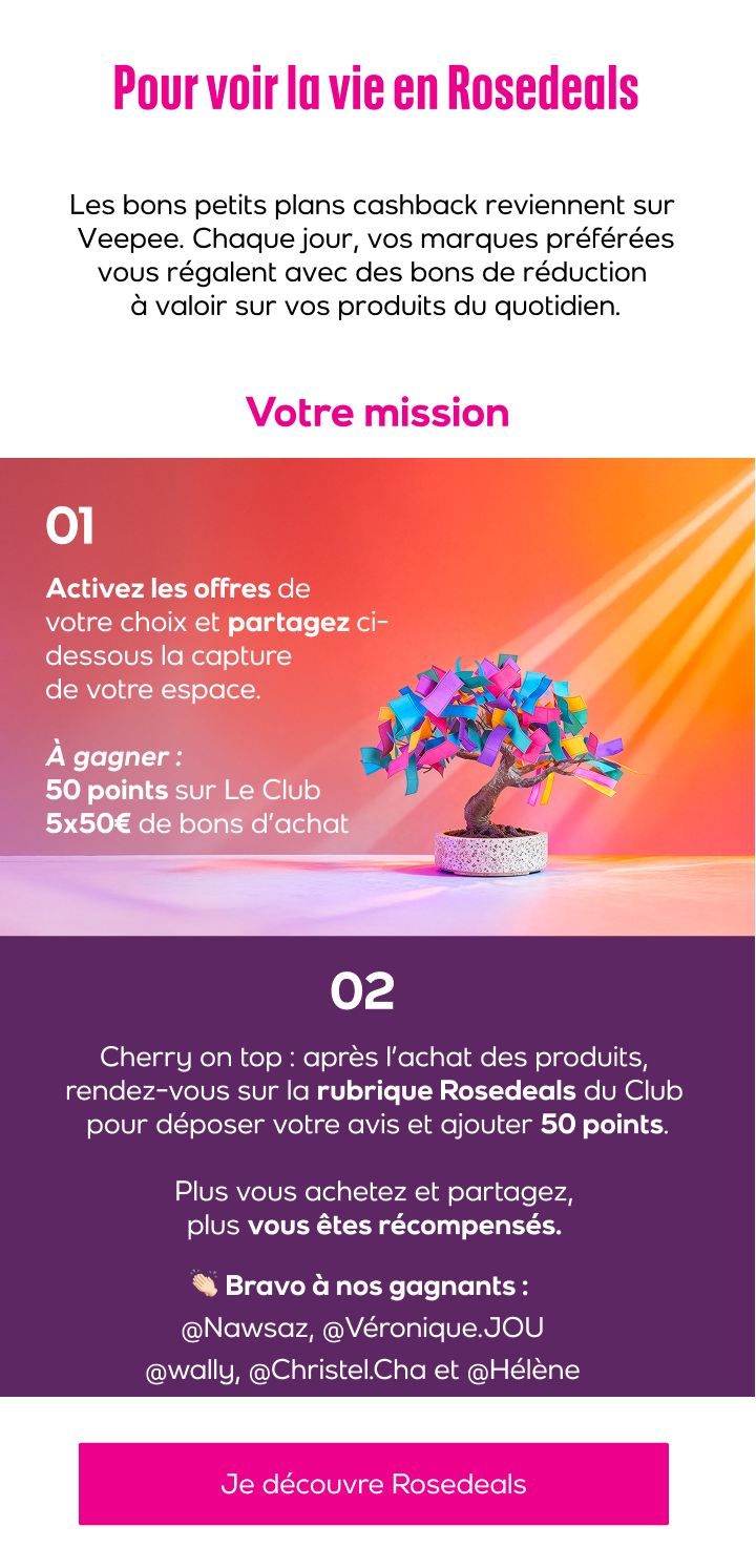 Participez au challenge en partageant vos activations Rosedeals. Cliquez sur le bouton "Publier" ci-dessus.