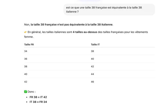 @ghislaine Bonjour, malheureusement non, il y a 2 tailles de différences entre la taille italienne et la taille francaise, d'ailleurs pour avoir une taille 40 par exemple française, il faut prendre une taille 44 italienne. Je commande énormement de vêtements de marque pour l'avoir remarqué. Voici d'ailleurs la question posée à Chatgpt qui est également clair à ce sujet!